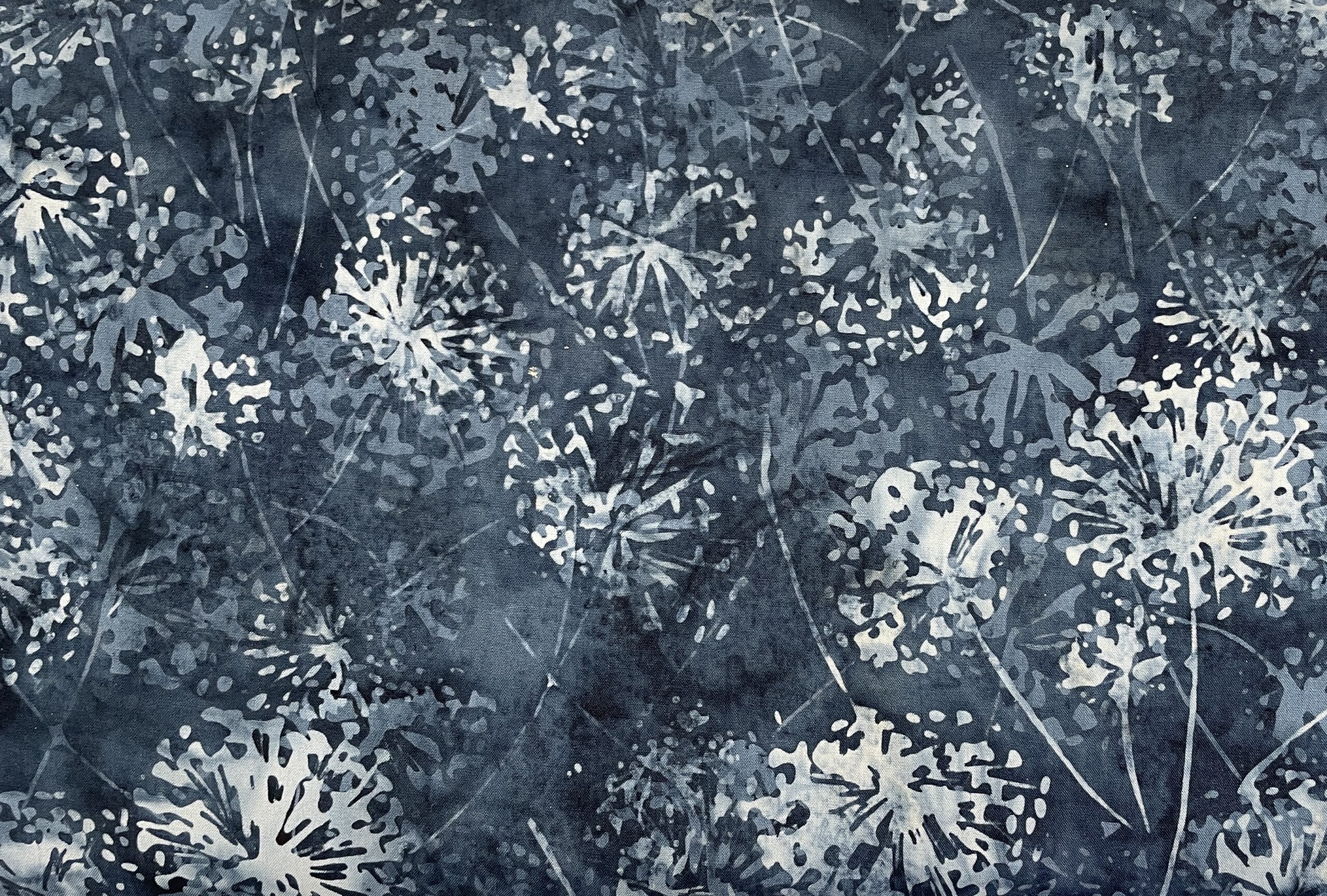Smukt og stemningsfuldt batikstof i en elegant blågrå farveskala med fine frøstande som motiv. Stoffet har et roligt og harmonisk udtryk, hvor de afdæmpede nuancer skaber dybde og et levende farvespil i baggrunden. De delikate frøstande tilfører et naturligt og let botanisk præg, som giver designet karakter uden at virke dominerende.