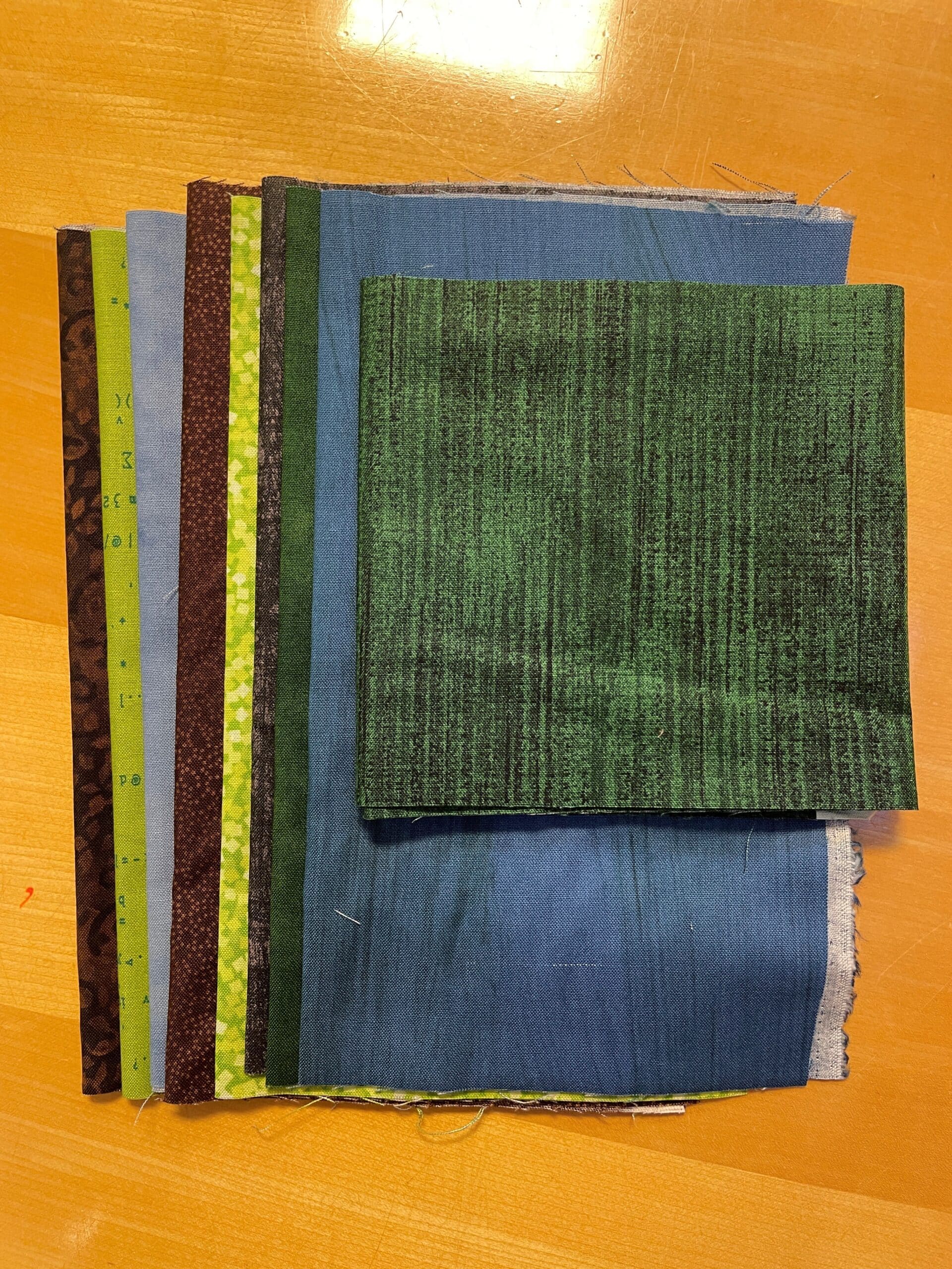 Stof til rektangler samt træer (der er lidt ekstra i pakken), stof til lukkekant og mønster samt vejledning.