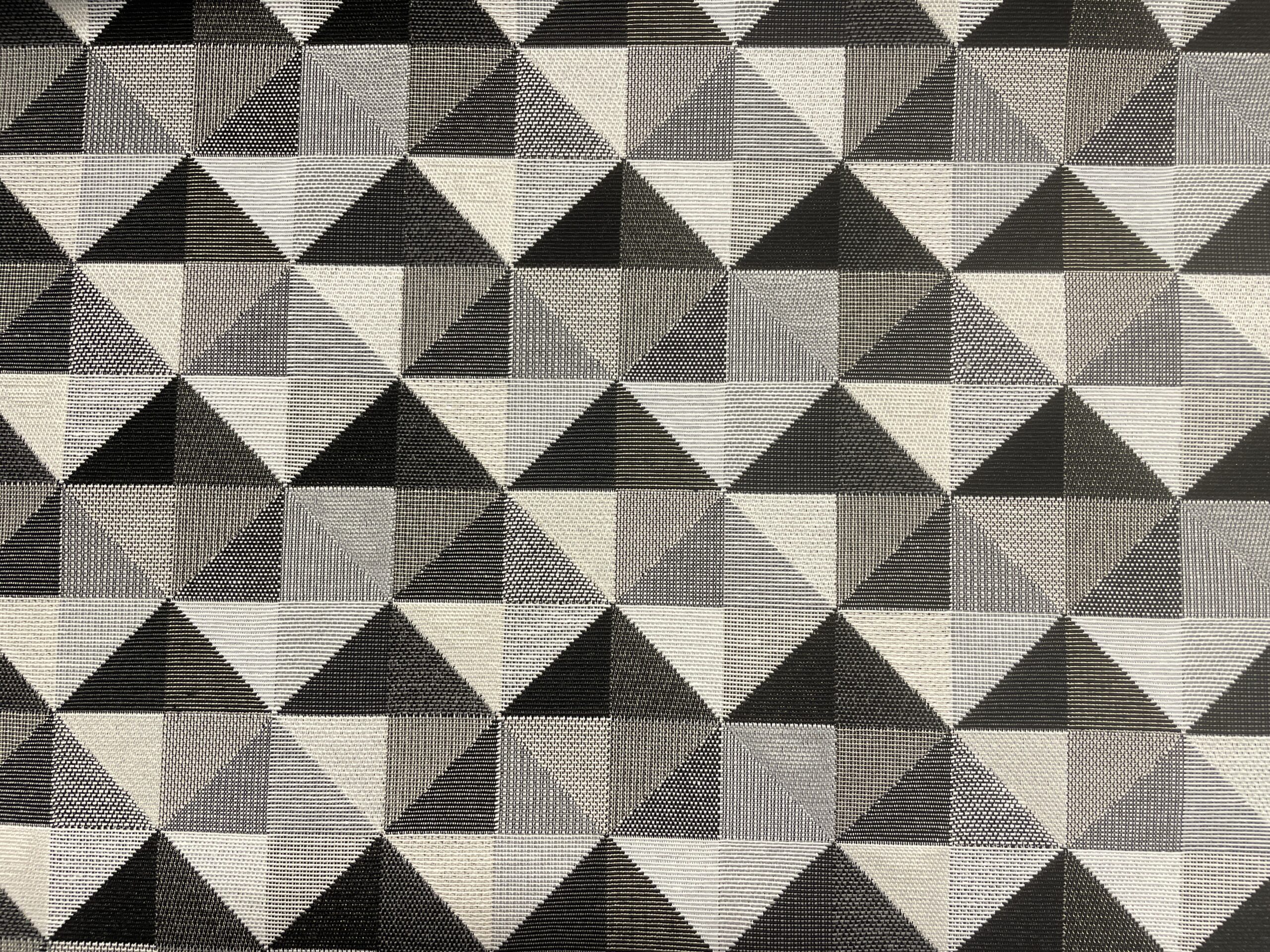 Et stilrent og moderne gobelin stof i kraftig kvalitet, der kombinerer holdbarhed med et grafisk og tidløst design. Stoffet måler 140 cm i bredden og er vævet med et mønster af trekanter i sort og hvid, som giver et markant og elegant udtryk.