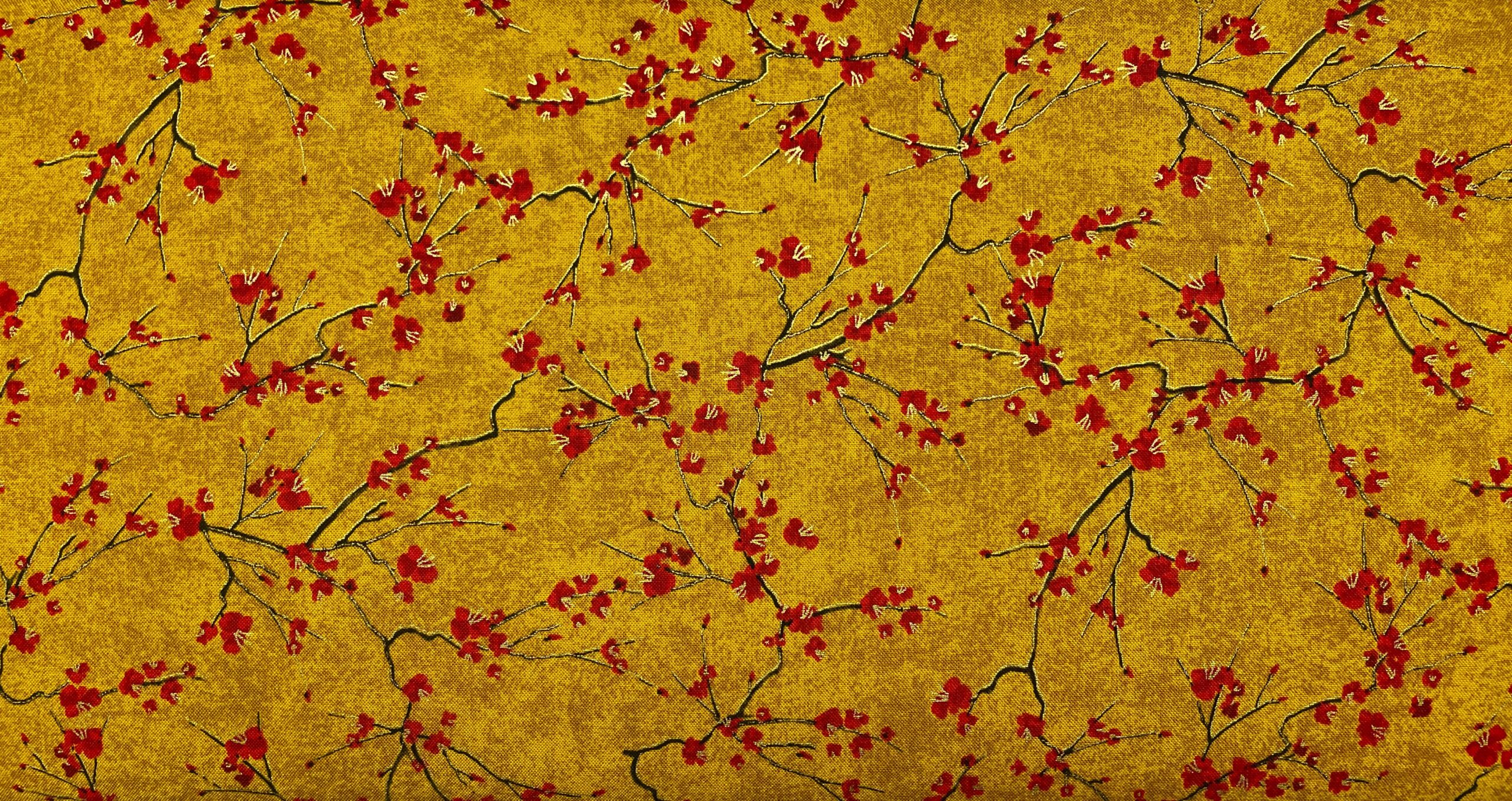 100% Bomuldsstof – Gyldent med Grene og Røde Blomster – Japansk Inspireret Lotusdesign