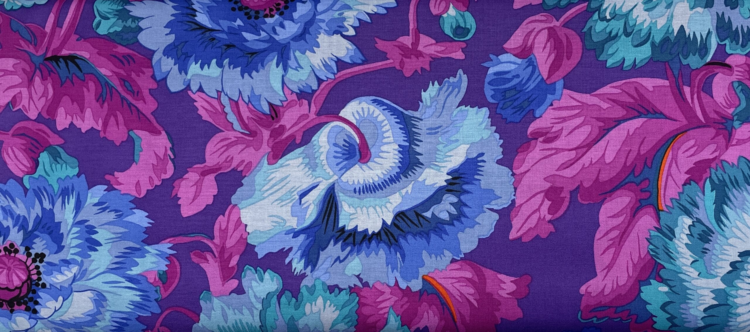Dette smukke stof er en del af Kaffe Fassett’s velkendte farverige designunivers, hvor blomster, former og farver får lov til at folde sig ud i en både legende og kunstnerisk helhed. Rosemary Blue har en blød, dyb lilla bund, som skaber en fantastisk baggrund for de store, runde valmueblomster i nuancer af blå, pink og lavendel. Udtrykket er stemningsfuldt, feminint og fuld af liv – et stof, der både kan være hovedperson og farvesætning i dine kreative projekter.
